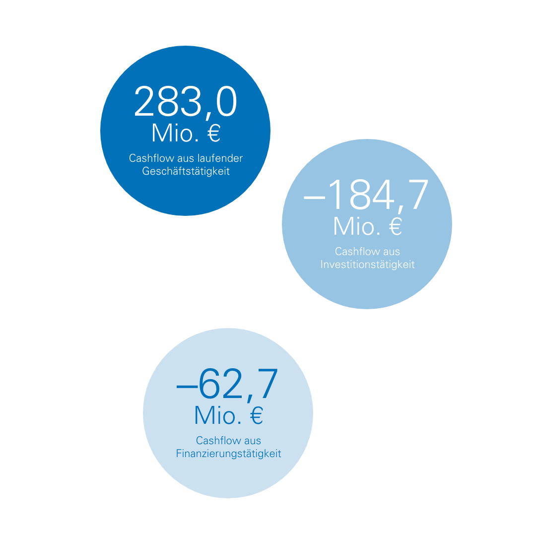 Der positive Cashflow aus laufender Geschäftstätigkeit betrug im Geschäftsjahr 2024 Mio. € 283,0 und lag damit um 39,2 % über dem Vorjahreswert. Die Veränderung ist im Wesentlichen auf das verbesserte Konzernergebnis zurückzuführen. Dem Konzernergebnis von Mio. € 132,6 standen nicht zahlungswirksame Abschreibungen von Mio. € 143,3 (Vorjahr: Mio. € 145,4) gegenüber. Der negative Cashflow aus Investitionstätigkeit verringerte sich gegenüber dem Vorjahr leicht um Mio. € 12,8. Der negative Cashflow aus Finanzierungstätigkeit betrug im Geschäftsjahr 2024 Mio. € 62,7 und lag damit nahezu auf dem Vorjahresniveau.