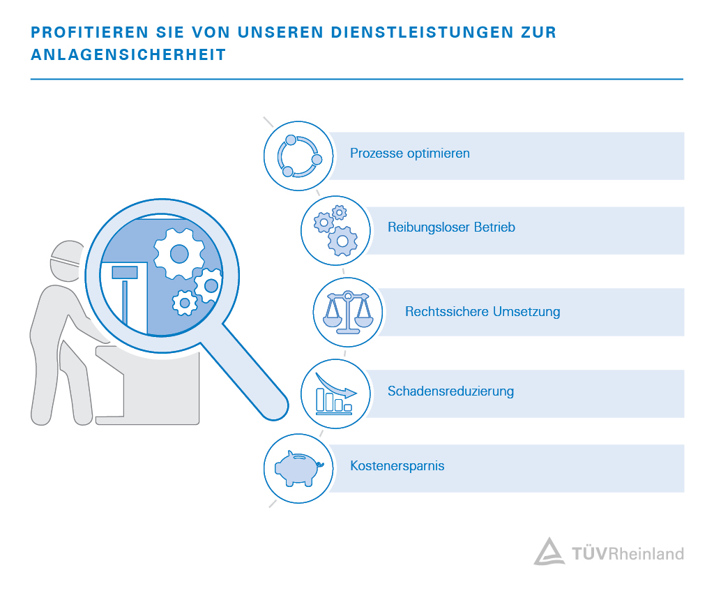 Mit unseren Services zur Anlagensicherheit verbessern Sie Ihre Prozesse und sorgen mit einem umfassenden Sicherheitsmanagement für einen reibungslosen und sicheren Betrieb. Durch die rechtssichere Umsetzung der gesetzlichen Vorschriften erfüllen Sie nicht nur Ihre Betreiberverantwortung, Sie reduzieren gleichzeitig die Gefahr von Schadensfällen und Ausfallzeiten.