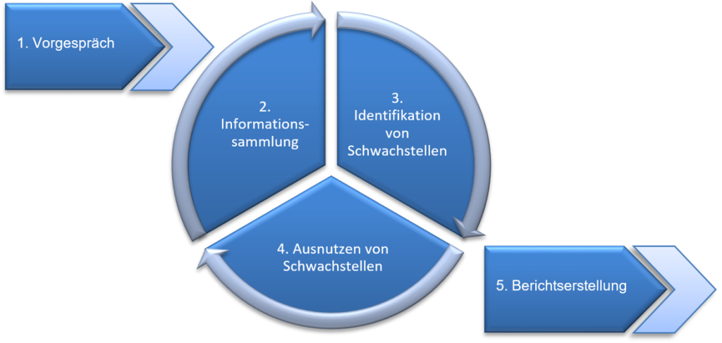 Mit den neuen gesammelten Informationen und zusätzlich identifizierten Schwachstellen versucht TÜV Rheinland, weitere Systeme zu übernehmen oder in weitere Netzbereiche vorzudringen. Dies bedeutet, dass Schritte 2, 3 und 4 mehrfach wiederholt werden können, sofern das Projektbudget noch ausreichend Zeit aufweist. Inwieweit ein tieferes Vordringen in die Infrastruktur im Rahmen des externen Penetrationstests gewünscht ist, wird im Rahmen des Vorgesprächs definiert.