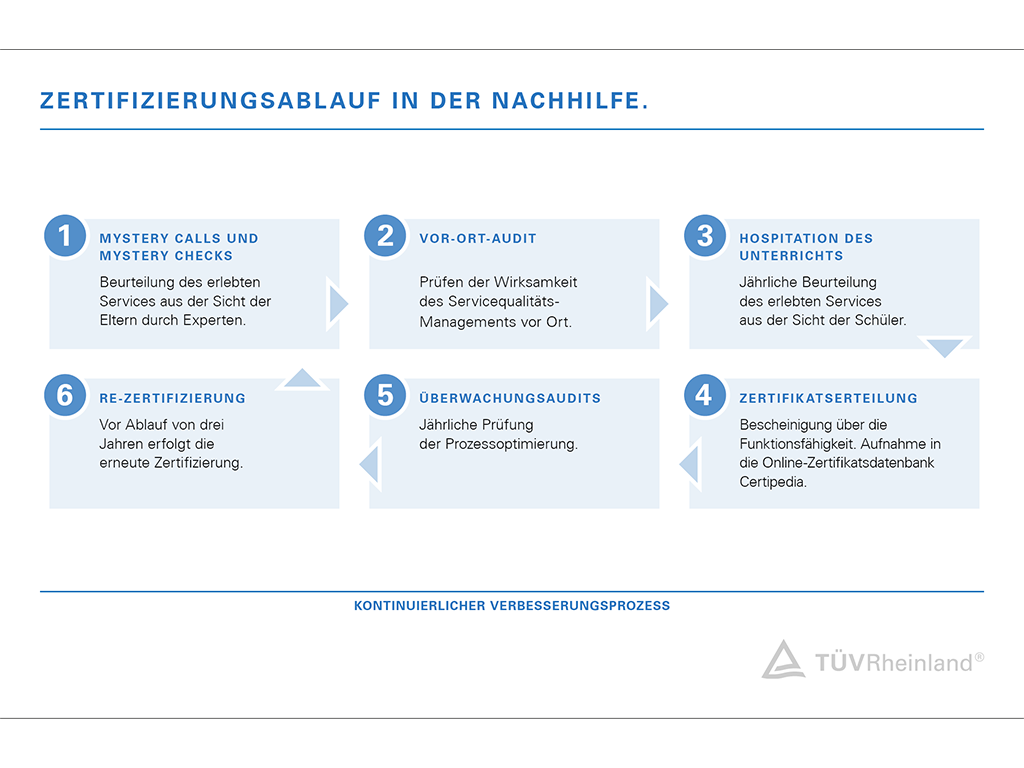 Der TÜV Rheinland Standard „Geprüfter Prozess“ ist ein Leitfaden für Nachhilfeinstitutionen mithilfe dessen die internen Abläufe optimiert und die Qualität der Nachhilfe sowie die Zufriedenheit der Eltern und Schüler:innen nachhaltig gesteigert werden kann.