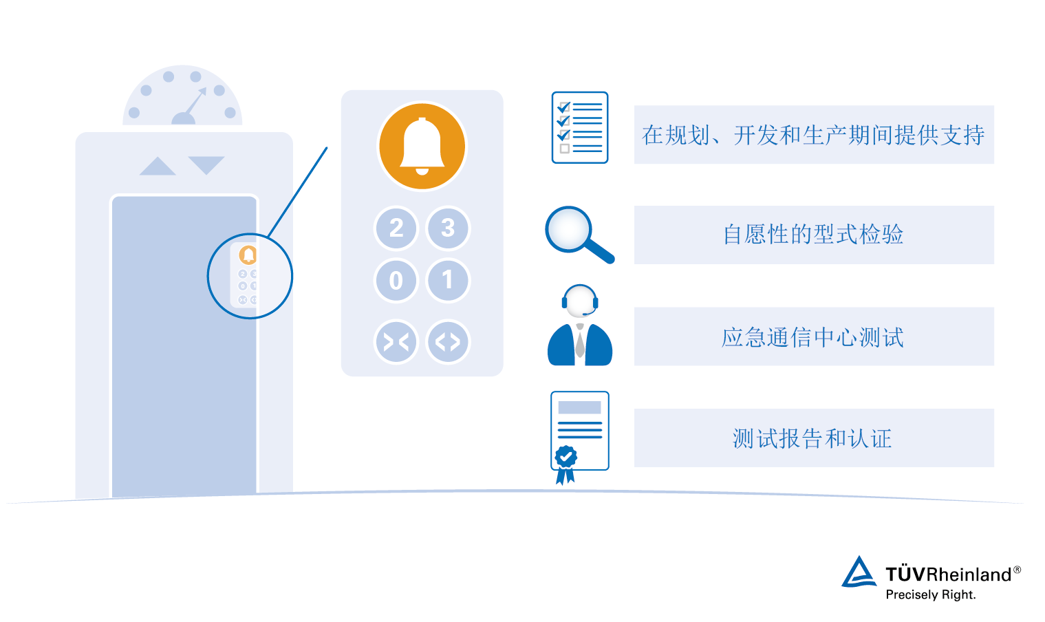 我们在电梯的安全和高效领域拥有丰富的经验,希望能竭诚为您服务。欢迎致电TÜV莱茵代表,我们将为您提供一站式服务和短测试时间。