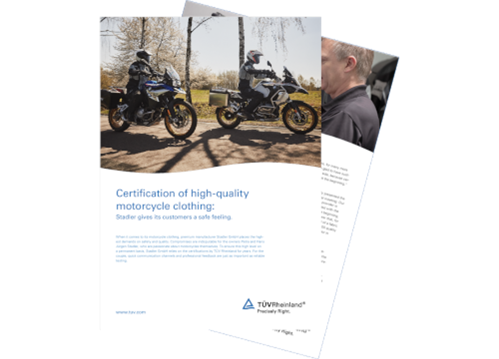 Find out about the successful partnership between TÜV Rheinland and Stadler, the renowned manufacturer of motorcycle clothing! Download our case study now and discover how TÜV Rheinland tested and certified the safety and quality of Stadler's clothing. It explains how TÜV Rheinland approached the testing of Stadler's clothing and the rigorous tests that were carried out to ensure the highest standards of safety, comfort and performance.