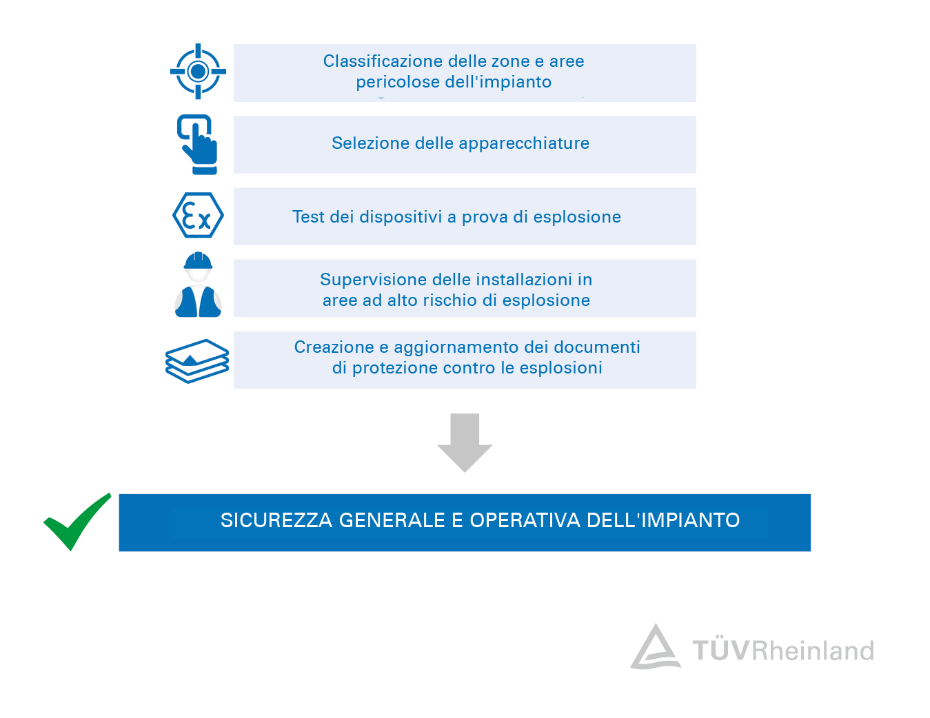 I nostri esperti analizzano e realizzano la classificazione delle aree, supervisionano le installazioni nuove o in servizio in atmosfere pericolose e redigono il documento di protezione contro le esplosioni. Integriamo la tua valutazione del rischio con un elenco di misure appositamente studiato per aumentare la sicurezza complessiva del tuo impianto e forniamo documentazione per la protezione contro le esplosioni nelle aree operative ad alto rischio. Disponiamo delle competenze e dell'esperienza per proteggere i tuoi beni e le tue attrezzature, oltre a garantire la sicurezza dei tuoi dipendenti.
