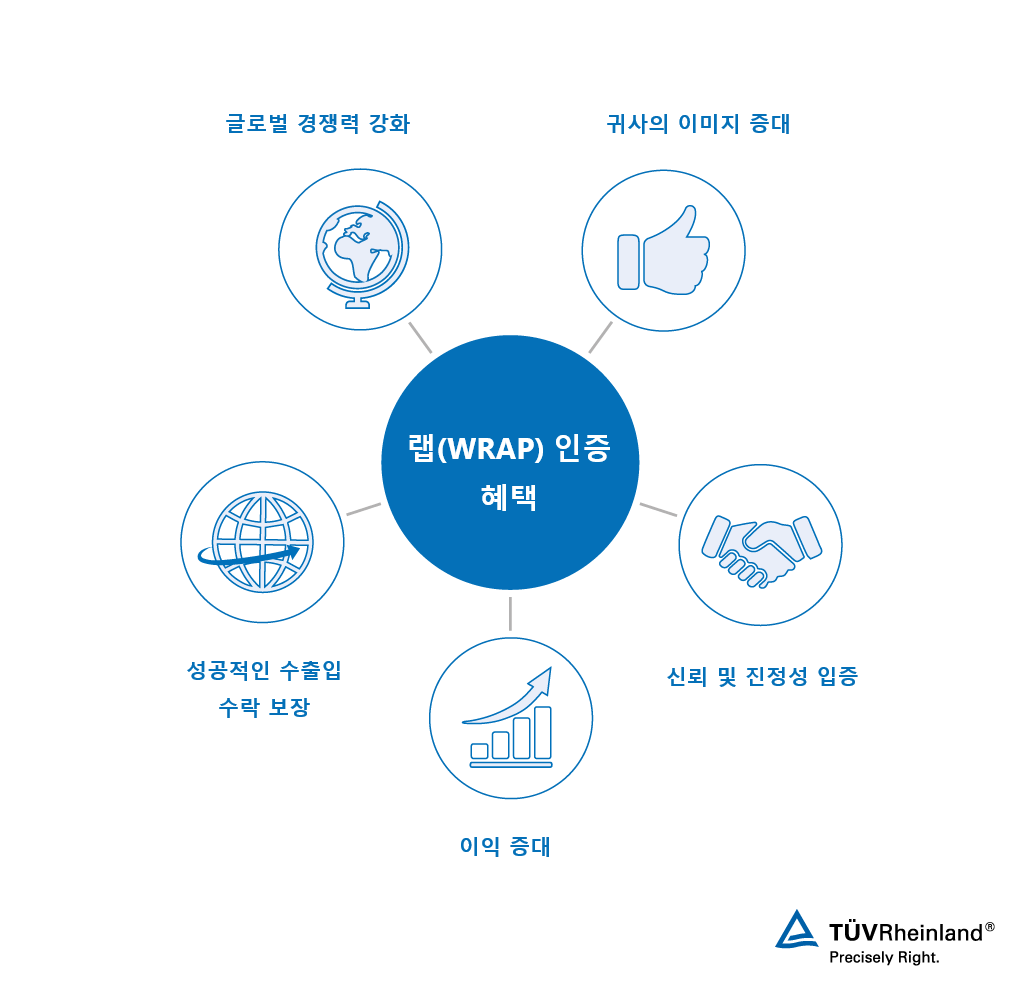 등록된 WRAP 심사기관으로서 TUV 라인란드는 WRAP 인증을 위한 종합적인 서비스를 제공합니다. 고도로 훈련된 직원들이 프로세스의 모든 단계를 안내하기 위해 전담으로 선발, 지원하게 됩니다. WRAP 인증 원칙은 일반적으로 인정되는 국제 표준, 현지 법률 및 작업장 규정들을 기준으로 합니다. 이러한 원칙은 인적 자원 관리, 보건 및 안전 이행, 효과적인 환경 보호 등을 평가하게 됩니다. 또한 WRAP은 법적 요건, 수출입 통관 규정 및 모든 관련 보안 표준을 준수하기 위한 지침도 제공합니다.