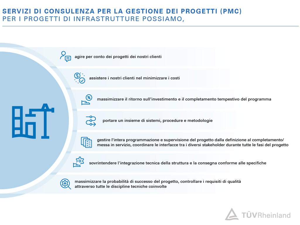 • Supervisione della costruzione (controllo qualità dei servizi, misurazione dei progressi, pianificazione generale e programmazione di tutte le attività, gestione delle interfacce, certificati di accettazione, ecc.)