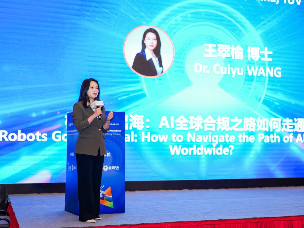 大会期间,TÜV莱茵大中华区电子电气产品服务科学家王翠榆博士发表了题为《机器人出海:AI全球合规之路如何走通》的演讲。她结合TÜV莱茵多年服务全球企业的实践经验,深入解析了包括《欧洲人工智能法案》在内的全球主要法规对人形机器人行业的最新要求与挑战。她详细介绍了AI系统的风险分级管理框架、高风险AI系统的核心合规义务,并为企业提供了贯穿产品全生命周期的合规管理体系的建设路径。