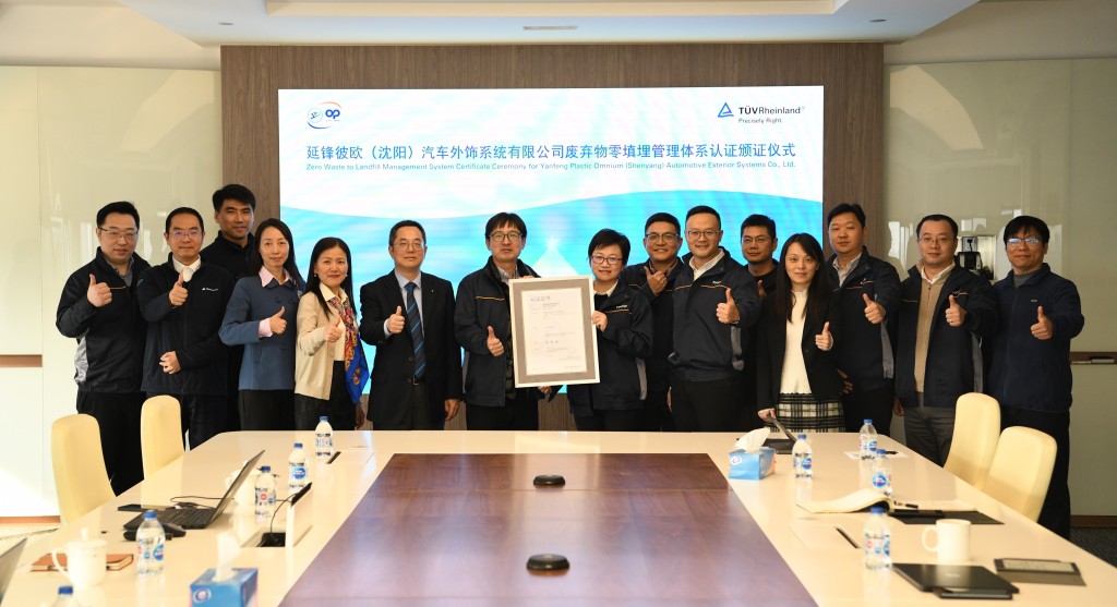 日前,国际独立第三方检测、检验和认证机构德国莱茵TÜV大中华区(简称“TÜV莱茵”)为延锋彼欧(沈阳)汽车外饰系统有限公司(简称“延锋彼欧沈阳公司”)颁发了废弃物零填埋管理体系认证(亦称“零废工厂”认证)证书。这是TÜV莱茵颁发的汽车零部件行业首张“零废工厂”认证证书。延锋彼欧汽车外饰系统有限公司业务副总经理余翀、TÜV莱茵大中华区管理体系服务副总裁方为民等双方代表出席了颁证仪式。