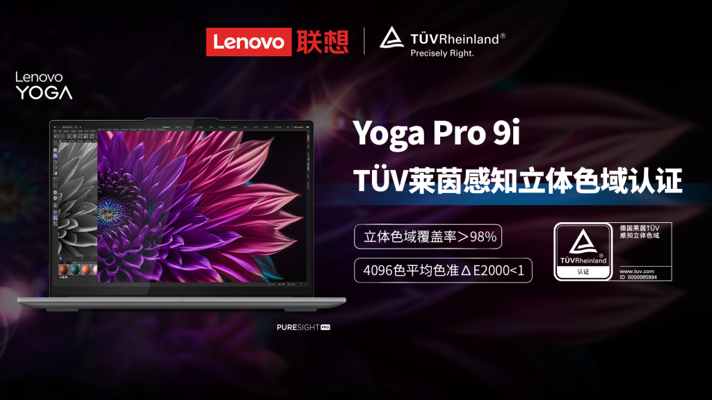 联想Yoga Pro 9i笔记本获颁TÜV莱茵“感知立体色域”认证证书