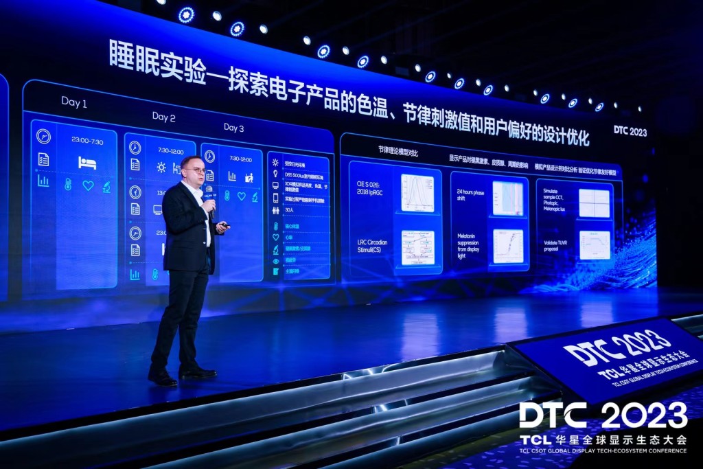 郝福来首先从用户的整体视觉健康、非视觉机制对人体长远健康的影响、通过设备与人的交互实现更好的健康管理等维度,阐述了如何满足用户对于显示产品的视觉健康与舒适体验需求,并分享了TÜV莱茵显示服务的发展逻辑和路线图。他还详细介绍了TÜV莱茵在节律友好、立体色域等领域的最新研究成果及相关服务。