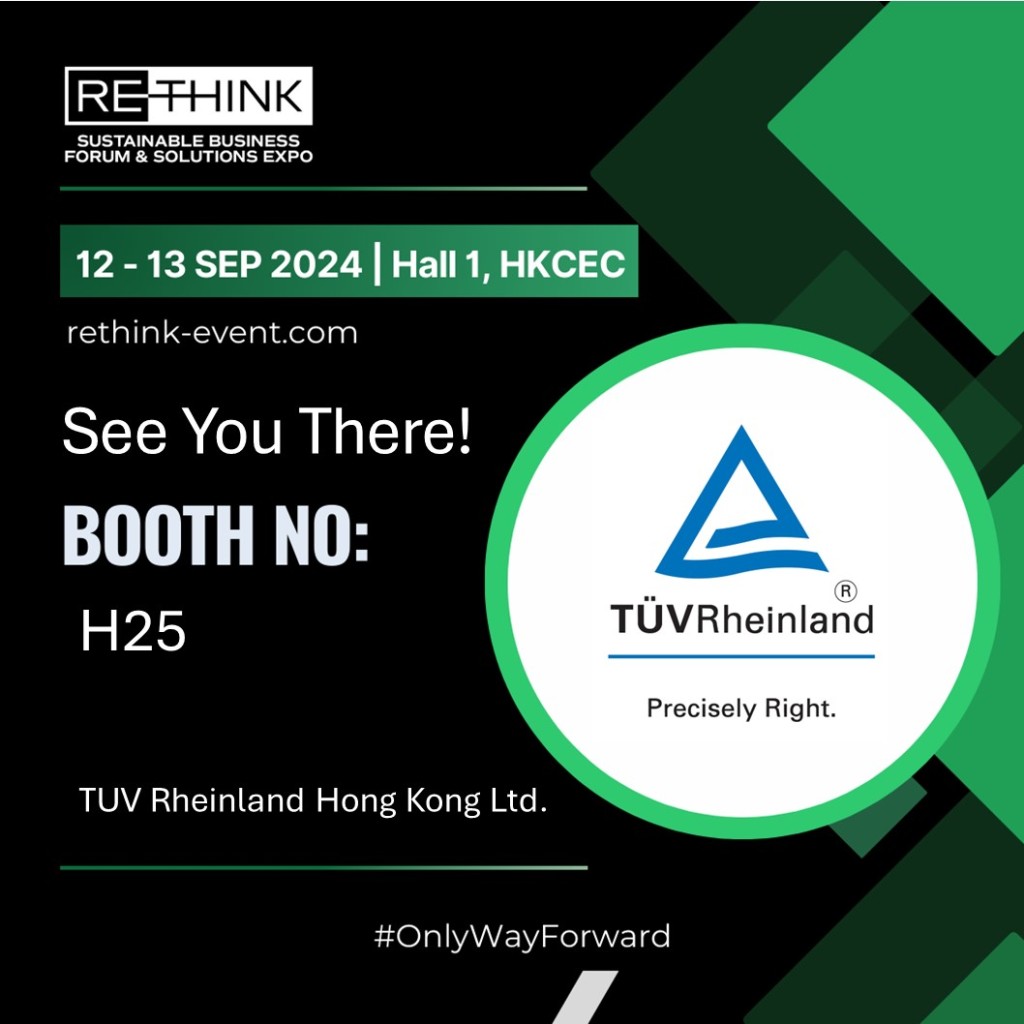 TÜV Rheinland Hong Kong is excited to announce its participation in ReThink HK 2024, taking place on 12-13 September at the Hong Kong Convention and Exhibition Centre. As a global leader in sustainability solutions and environmental governance, TÜV Rheinland will be showcasing its cutting-edge strategies and services aimed at fostering a circular economy, promoting sustainable living, and revolutionizing mobility at Booth H25.