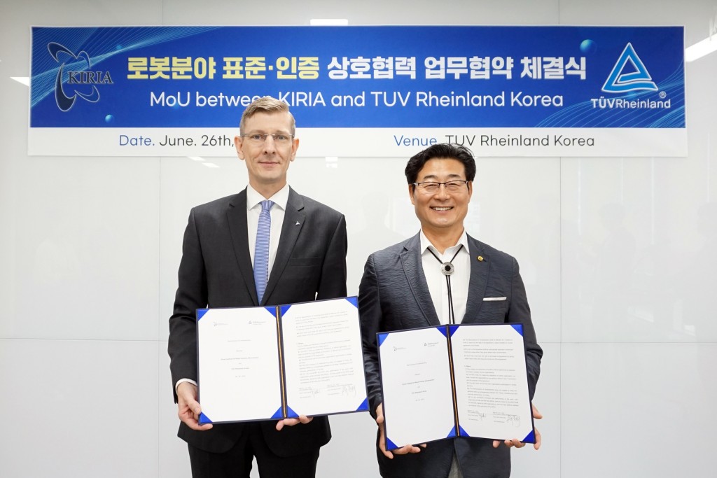 티유브이 라인란드 코리아(TUV Rheinland Korea)와 한국로봇산업진흥원은 6월 26일, 산업용 로봇 및 자율주행 로봇 관련 표준·인증 상호협력과 국내 로봇 기업의 수출 지원을 위해 업무 협약 체결식을 개최했습니다.