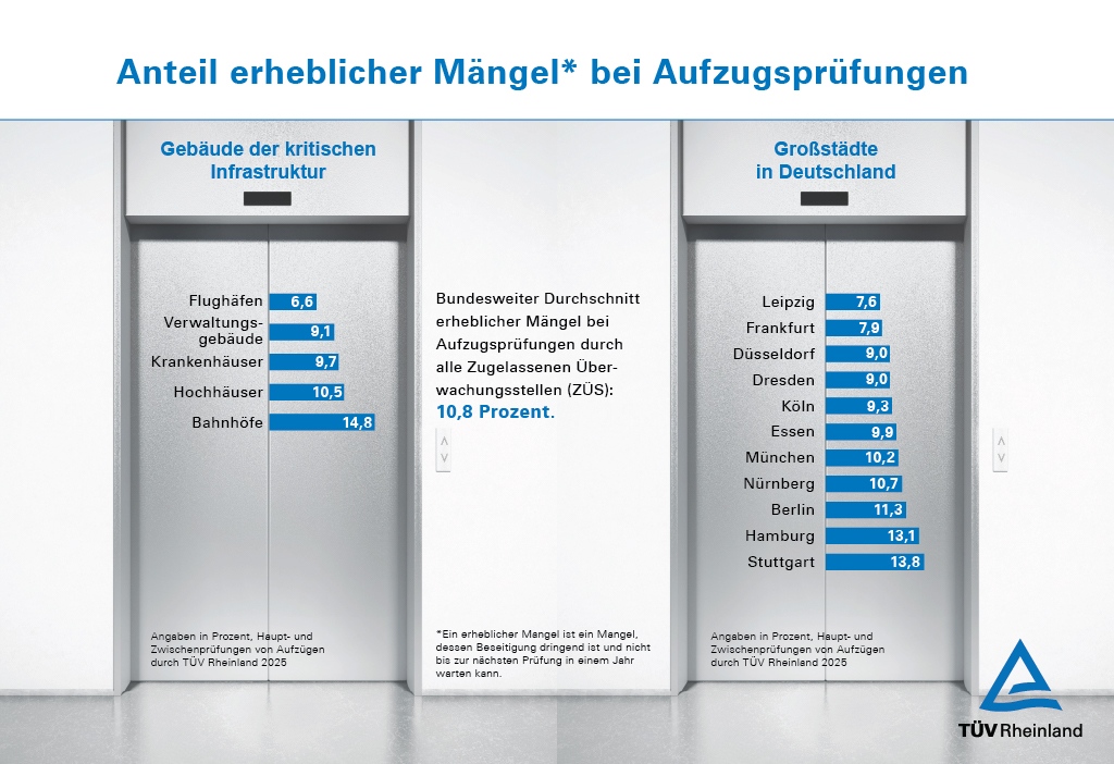 Anlagensicherheitsreport des TÜV-Verbands zeigt Zustand technischer Anlagen / TÜV Rheinland mit zusätzlicher Auswertung für Aufzüge in Gebäuden der kritischen Infrastruktur und Großstädten deutschlandweit