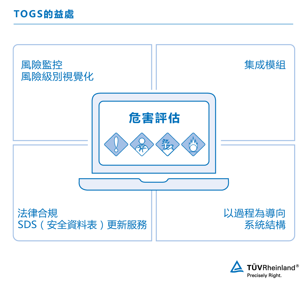 TOGs®是我們的線上有害物質管理系統,旨在幫助組織掌握圍繞此問題的複雜法律網要求。資訊被收集、評估並記錄在危險材料中心登記處。這為之後的步驟奠定了基礎,例如為您的員工、客戶與環境發布危害評估、操作指示,或降低風險。