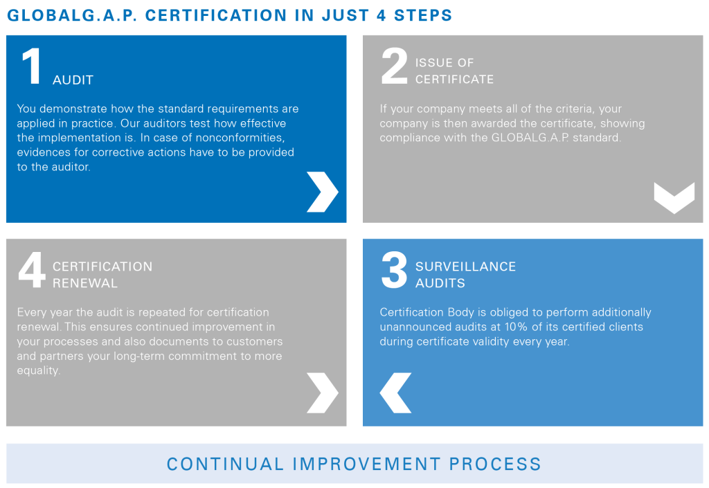 • GLOBALG.A.P. IFA - Integrated Farm Assurance. This certificate covers fruit and vegetables, combinable crops, flowers and ornamentals, plant propagation material, hop, tea.