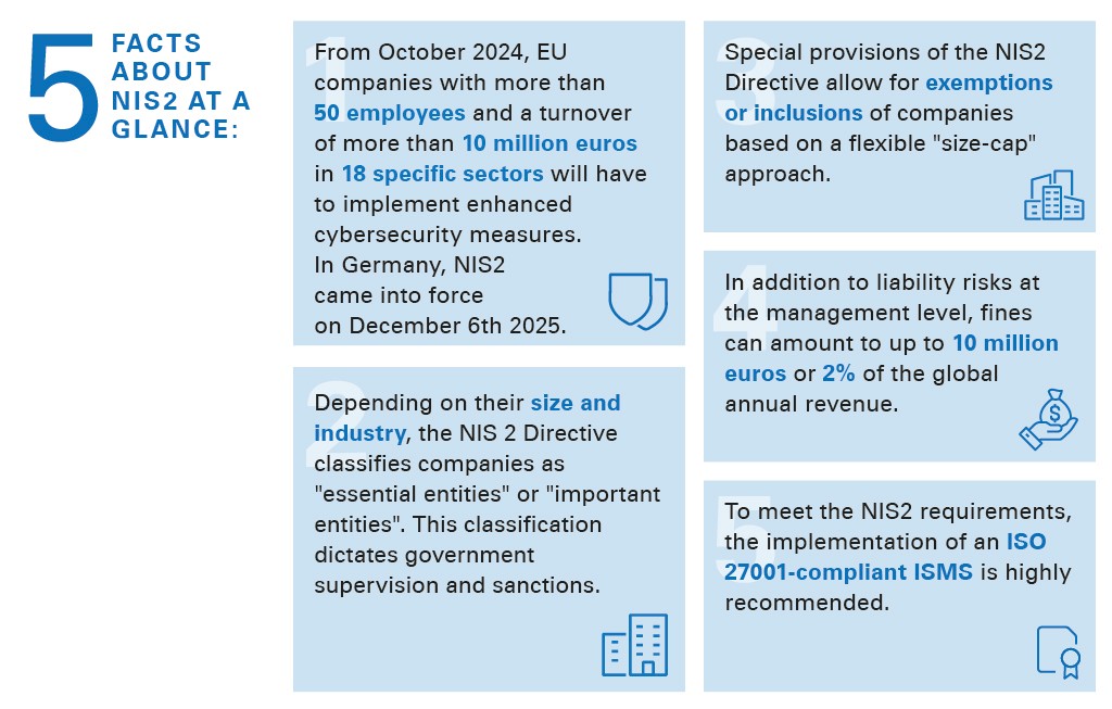 The most significant change is the expanded scope of companies required to comply. Additionally, the cybersecurity requirements are now more stringent: affected companies must implement appropriate “state of the art” measures in areas such as risk management, business continuity management (BCM), supply chain security and incident response.